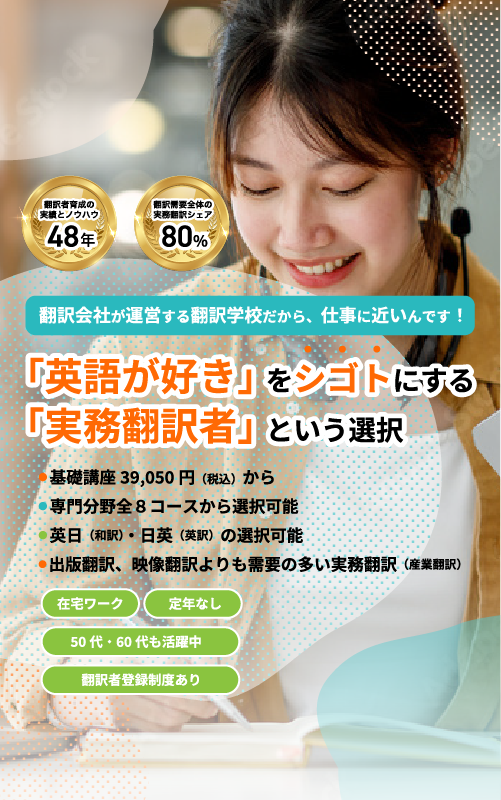 - 実務翻訳には、英語力だけではなく、原文を理解するための(専門)知識・調査力、原文の意図を正確かつ自然な表現で伝えるための日本語力が不可欠です。そのため、英語力にかかわらず、翻訳を学ぶのが初めてでしたら、基礎講座からスタートいただくことをおすすめしています。基礎から学ぶ実務翻訳講座では、さまざまなジャンルの翻訳課題を扱っていますので、専門分野がまだ決まっていない方にも、専門分野を検討いただく参考となります。